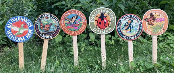 In stock: Pollinator Friendly Garden (Monarch), Welcome Pollinators, Pesticide Free Garden, Milkweed for Monarchs, and (not shown) Native Plants Benefit Butterflies